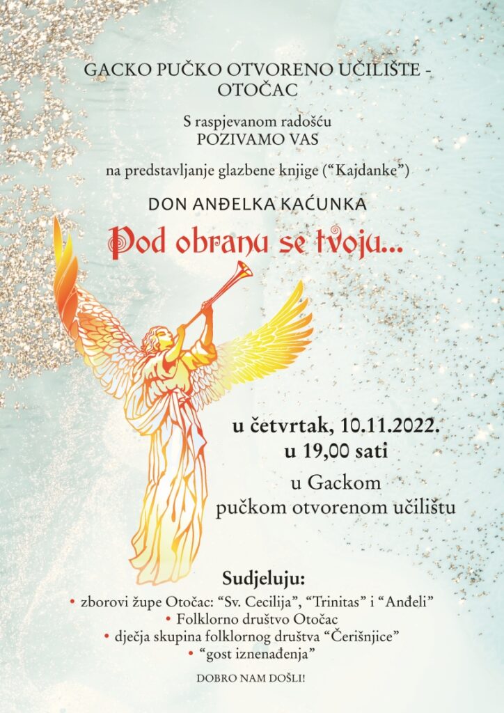 OTOČAC – Dana 10. studenog 2022., s početkom u 19:00 sati u Gackom pučkom otvorenom učilištu Otočac održati će se predstavljanje knjige pjesama „Pod obranu se tvoju…“ autora don Anđelka Kaćunka.