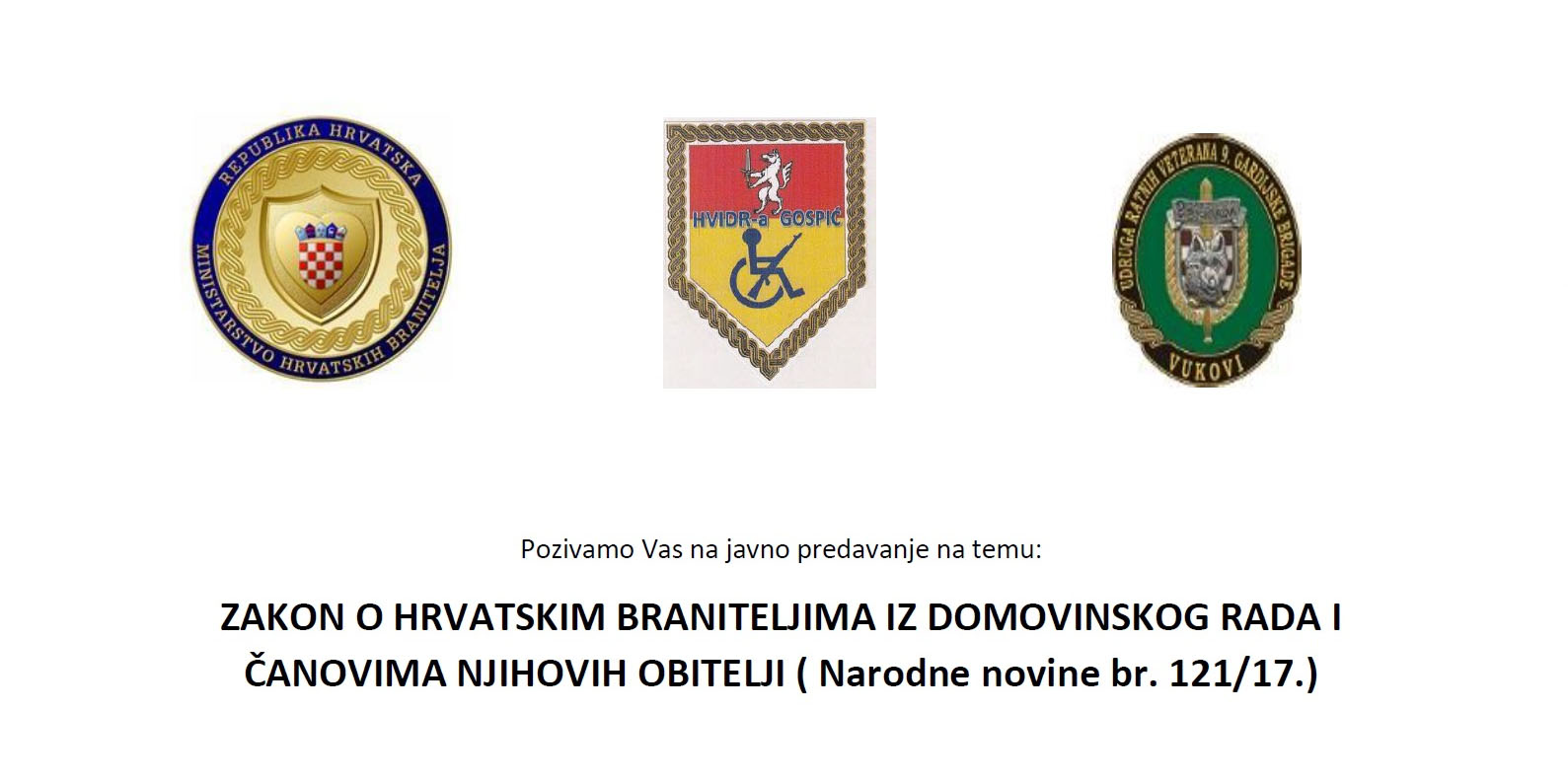 Dana 06. 11. 2018. godine u 18 sati u velikoj dvorani KIC-a u Gospiću održat će se predavanje na temu novoga Zakona o hrvatskim braniteljima. U sklopu predstavljanja Zakona prisutni će se upoznati i sa pripadajućim pravilnicima koji su doneseni naknadno.