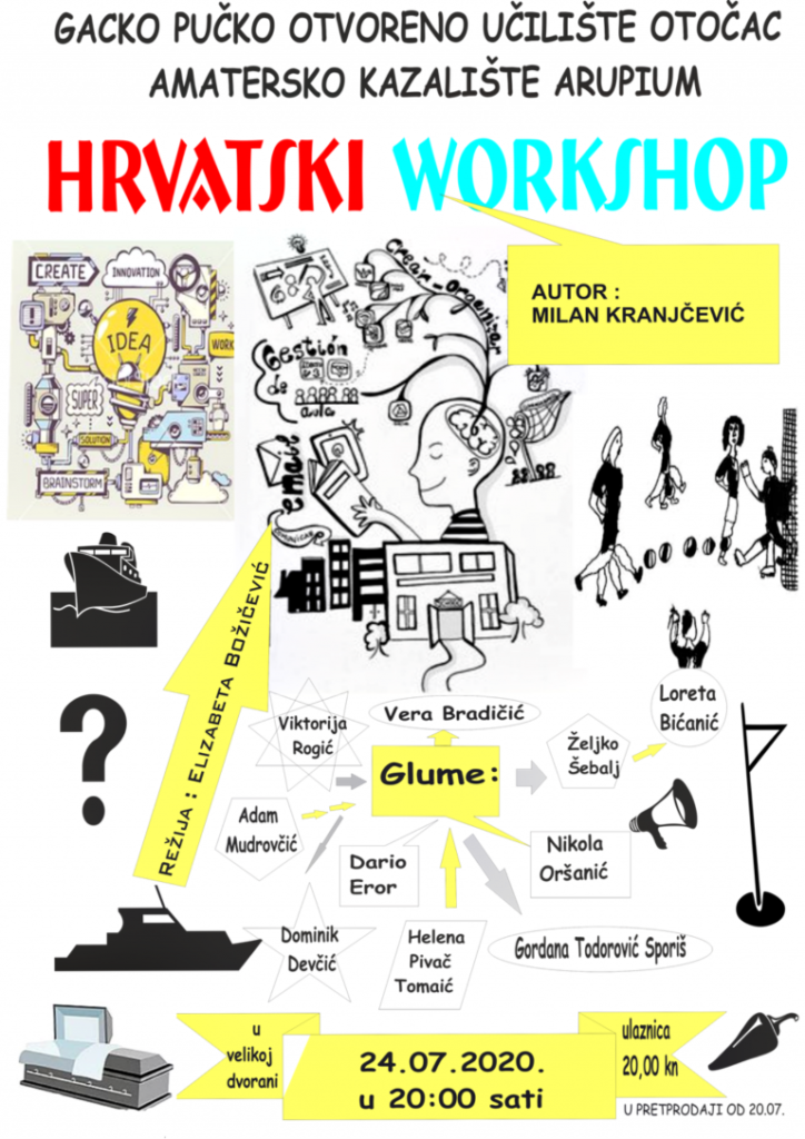 OTOČAC – Premijera predstave Hrvatski workshop u izvedbi Amaterskog kazališta Arupium održat će se u Gackom pučkom otvorenom učilištu Otočac 24. srpnja 2020. u 20 sati. Ovu komediju nastalu prema tekstu Milana Kranjčevića režirala je Elizabeta Božičević, a u predstavi glume dugogodišnji i novi članovi Arupiuma: Gordana Todorović Sporiš, Nikola Oršanić, Loreta Bićanić, Vera Bradičić, Dominik Devčić, Helena Pivač Tomaić, Dario Eror, Viktorija Rogić, Adam Mudrovčić i Željko Šebalj.