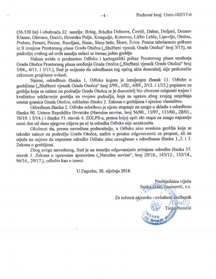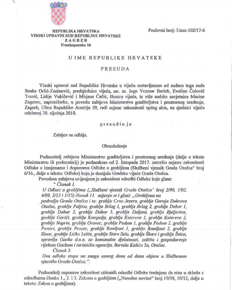 OTOČAC – Iz Ureda gradonačelnika Otočca Stjepana Kostelca dobili smo priopćenje u svezi presude Visokog upravnog suda od 30. siječnja 2018. godine, a vezano za zahtjev Ministarstva graditeljstva i prostornog uređenja o ocjeni zakonitosti Odluke o izmjenama i dopunama Odluke o grobljima koju je donijelo Gradsko vijeće Grada Otočca (Službeni vjesnik Grada Otočca broj 6/16).
