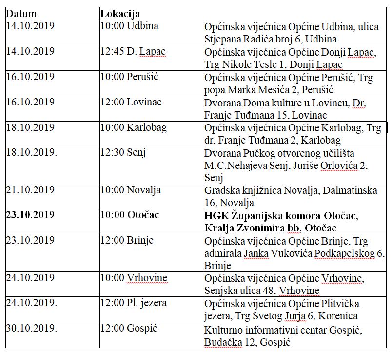 Prezentacije Projekta održat će se u svim jedinicama lokalne samouprave, a u Otočcu prezentacija će se održati u prostorijama HGK Županijska komora Otočac, Kralja Zvonimira bb, Otočac. Prezentacija Projekta u ostalim gradovima i općinama na području Županije održati će se prema sljedećem rasporedu: