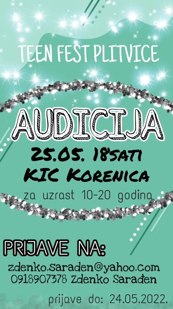 KORENICA – Audicija” Teen fest Plitvice” za uzraste od 10 – 20 godina održati će se u srijedu, 25.svibnja 2022. s početkom u 18:00 sati u KIC-u Korenica. Prijave za audiciju traju do 24. svibnja, a prijaviti se možete putem e-maila: zdenko.saraden@yahoo.com ili na broj mobitela: 091/8907-378.