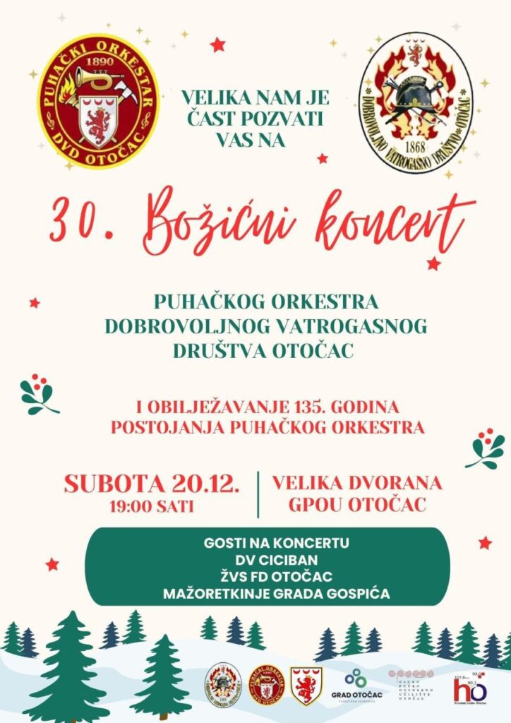 OTOČAC – U subotu, 20. prosinca održati će se 30. tradicionalni Božićni koncert Puhačkog orkestra DVD-a Otočac u velikoj dvorani GPOU Otočac. I ove će godine gostovati Dječji Vrtić Ciciban, Mažoretkinje grada Gospića te članice Ženske vokalne skupine FD OTOČAC. Puhački orkestar DVD-a Otočac ove godine, osim jubilarnog 30. koncerta, slavi i 135 godina postojanja puhačkog orkestra.