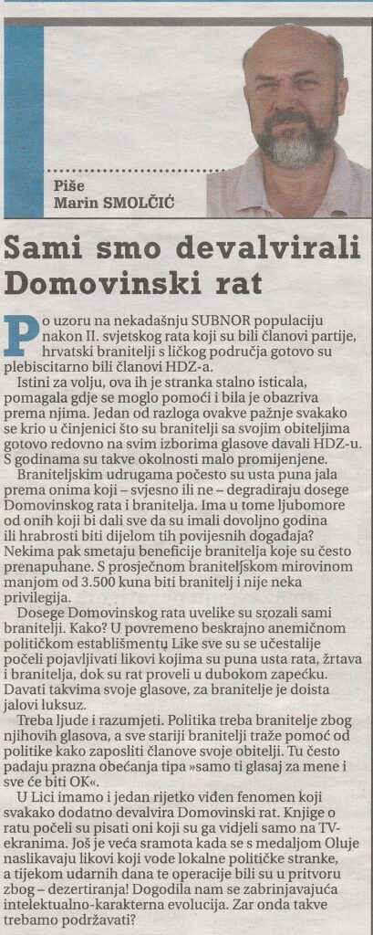 Zanimljiv članak objavljen je u današnjem tiskanom izdanju Novog lista pod naslovom „Sami smo devalvirali Domovinski rat“. Ono što na kraju teksta posebno upada u oči je činjenica koja je mnogima od nas poznata. Osoba koja je primila medalju VRO „Oluja“ je za vrijeme iste te „Oluje“ bila pritvorena zbog dezerterstva. Apsurd da ne može biti veći. A upravo se toj osobi klanjaju upravo oni koji su u Domovinskom ratu proveli i po pet godina. Neki su se umirovljeni časnici spustili toliko nisko da su svojevremeno držali kišobran iznad glave ratnog dezertera da mu se ne pokvari postojana frizura. Upravo takvi pljuju na dignitet Domovinskog rata. Nažalost, oni toga nisu ni svjesni.