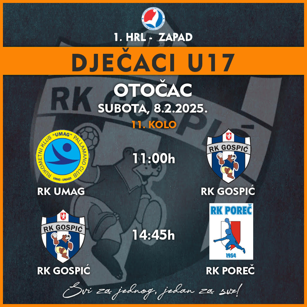 OTOČAC – U subotu, 8. veljače u Sportskoj dvorani Srednje škole Otočac odigrati će se dvije utakmice 11. kola 1. HRL Zapad. Tako će dječaci U17 (2007./2008.) Rukometnog kluba “Gospić” u 11:00 sati odigrati prvu utakmicu protiv RK Umag, dok će drugu utakmicu u 14:45 odigrati protiv ekipe RK Poreč.