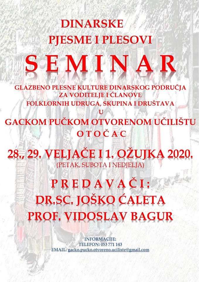 OTOČAC – Gacko pučko otvoreno učilište Otočac četvrti put organizira seminar “Dinarske pjesme i plesovi: glazbeno-plesna kultura dinarskog područja” namijenjen voditeljima i članovima folklornih skupina, društava i udruga koji će 28., 29. veljače i 1. ožujka 2020. godine biti održan u prostorijama Gackog pučkog otvorenog učilišta u Otočcu.