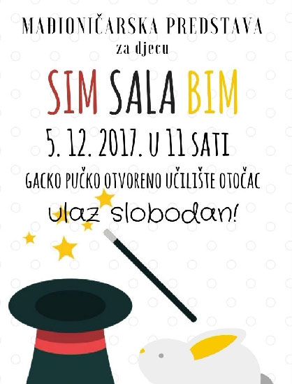 OTOČAC – za djecu predškolske i osnovnoškolske dobi u utorak, 5. prosinca 2017., u 11 sati u velikoj dvorani Gackog pučkog otvorenog učilišta Otočac održati će se mađioničarska predstava Sim Sala Bim, a koji će izvesti Ri Teatar iz Rijeke. Ulaz je besplatan!