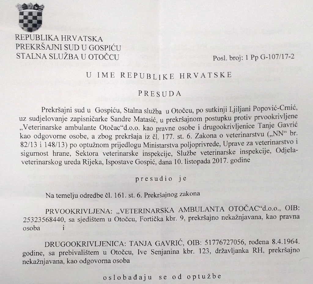 Prije nekoliko dana presudom Prekršajnog suda u Gospiću, Stalna služba u Otočcu oslobođeni su optužbi Veterinarska ambulanta Otočac i njena direktorica Tanja Gavrić zbog optužbi objavljenih na portalu gradske vijećnice Vlatke Ružić.