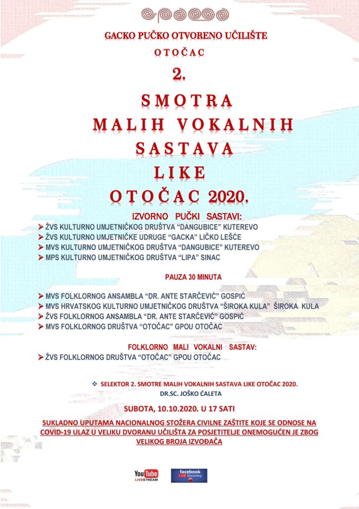OTOČAC – Smotra malih vokalnih sastava Like Otočac 2020. održat će se u subotu, 10.listopada 2020. u velikoj dvorani Gackog pučkog otvorenog učilišta u 17 sati. Na smotri će sudjelovati devet ženskih, muških i mješovitih pjevačkih skupina s područja Ličko-senjske županije koje će se natjecati u dvije kategorije, izvorno pučki i folklorno mali sastavi.