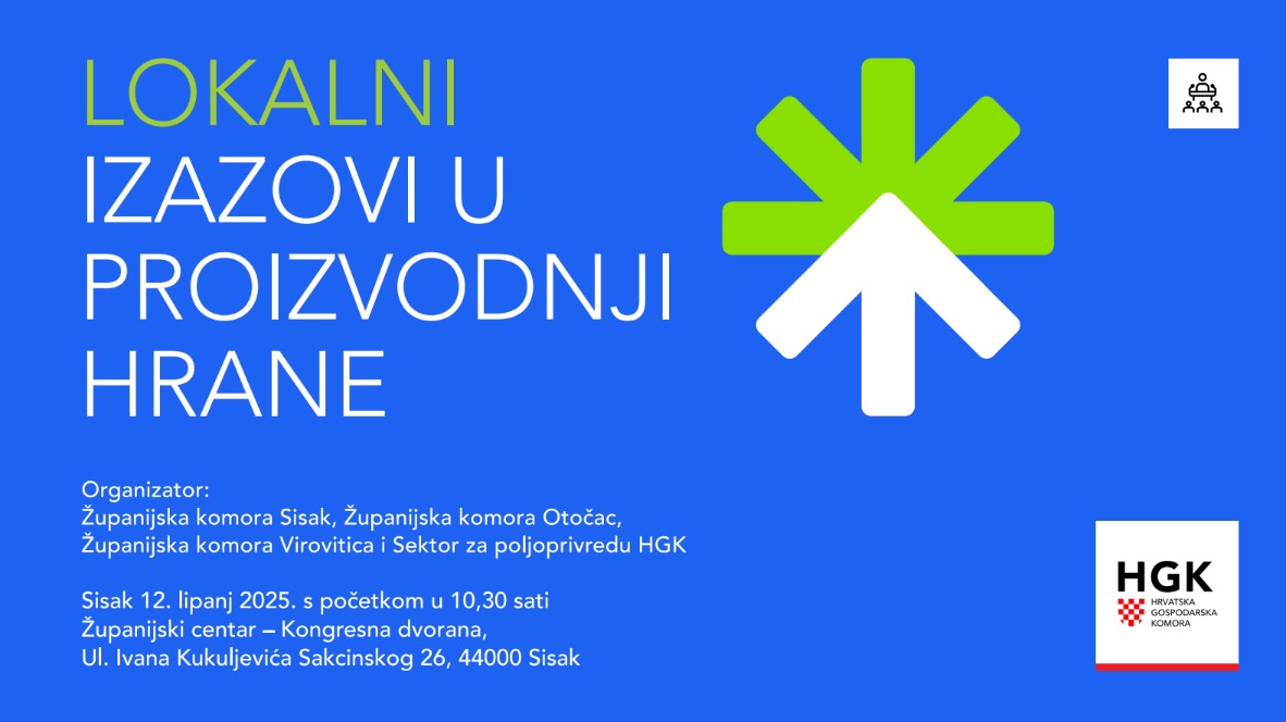 SISAK – Stručni skup “Lokalni izazovi u proizvodnji hrane” kojeg organizira Županijska komora Sisak u suradnji sa Županijskom komorom Otočac, Županijskom komorom Virovitica i Sektorom za poljoprivredu HGK održat će se 12. lipnja 2025. godine s početkom u 10:30 sati, u Sisku, Županijski centar – Kongresna dvorana I. K. Sakcinskog 26.