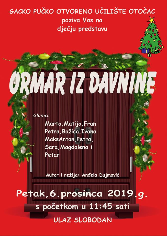 OTOČAC – I ove godine u Gacko pučko otvoreno učilište Otočac stiže sveti Nikola s predstavom za djecu “Ormar iz davnine”. Predstavu su u režiji Anđele Dujmović pripremili članovi dječje dramske skupine GPOU-a, a biti će prikazana 6. prosinca 2019. s početkom u 11:45.