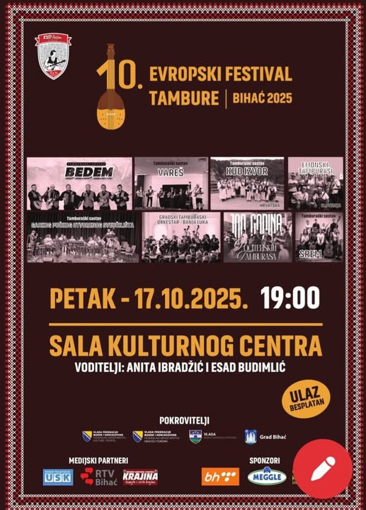 Tamburaški orkestar Gackog pučkog otvorenog učilišta Otočac sudjelovati će na 10. Europskom festivalu tambure, a koji će se održati u Bihaću u petak, 17. listopada. Festival tambure već deset godina okuplja tamburaše iz različitih krajeva Europe, a tako će biti i ovaj put. Festival će započeti u 19:00 sati u Sali Kulturnog centra Bihać, a nastupiti će nekoliko tamburaških sastava: Bedem, Vareš, KUD Izvor, Emonci, Srem, Tamburaški orkestar Gackog pučkog otvorenog učilišta Otočac i Gradski tamburaški orkestar Banja Luka.