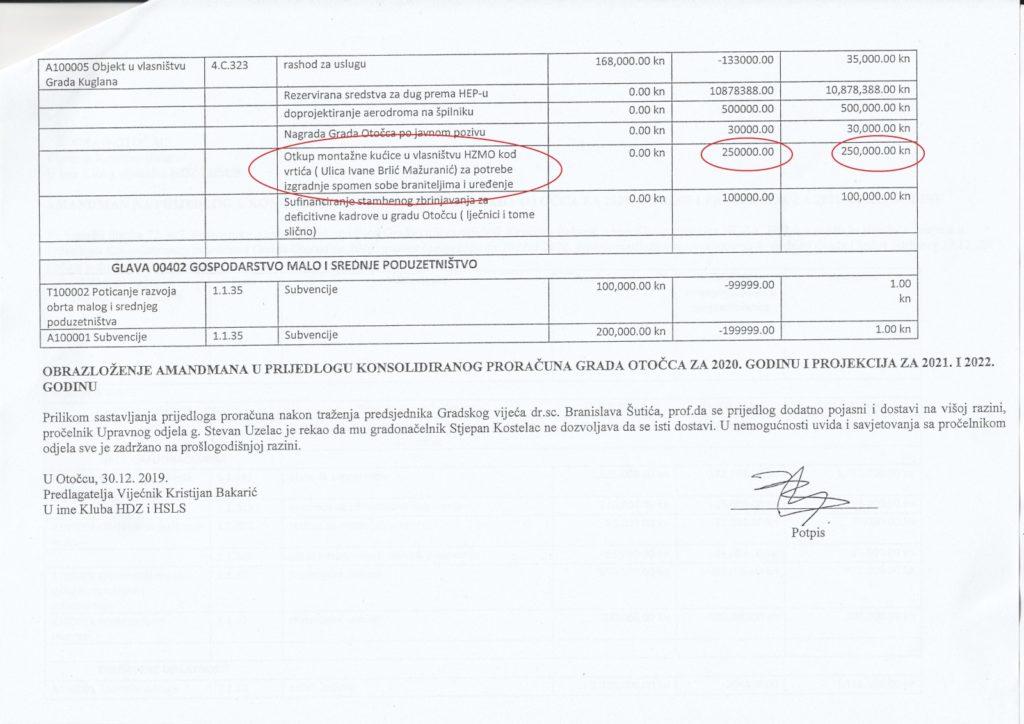 Amandmanom koji je u ime kluba HDZ/HSLS predložio vijećnik Kristijan Bakarić, a ista ta koalicija usvojila predložena je kupovina objekta koji se nalazi prekoputa dječjeg vrtića Ciciban. Radi se o montažnom objektu koji je u vlasništvu Hrvatskog zavoda za mirovinsko osiguranje i kojega već preko 20 godina nitko ne koristi. Otočki HDZ i njegov koalicijski partner HSLS žele ga kupiti da bi u njemu smjestili braniteljske udruge i uredili spomen-sobu poginulim braniteljima. Svakako je pohvalno da HDZ misli o hrvatskim braniteljima, ali nažalost zakasnili su. Naime, gradonačelnik Stjepan Kostelac već je dao braniteljskim udrugama 4 prostorije u novouređenoj županijskoj zgradi za njihove aktivnosti dok je u zgradi Gackog pučkog otvorenog učilišta određena jedna veća prostorija u kojoj će se urediti spomen soba za poginule hrvatske branitelje.