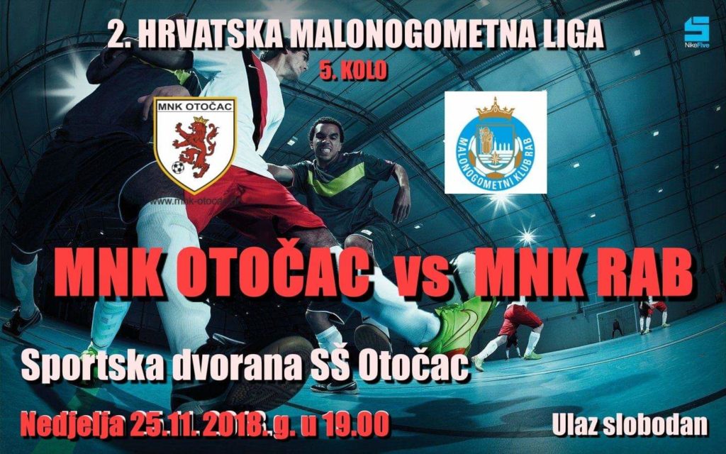 U nedjelju, 25. 11. u 19.00 sati u sportskoj dvorani Srednje škole Otočac odigrat će se malonogometna utakmica 5. kola 2. hrvatske malonogometne lige između MNK Otočac i MNK Rab. Ulaz je slobodan.
