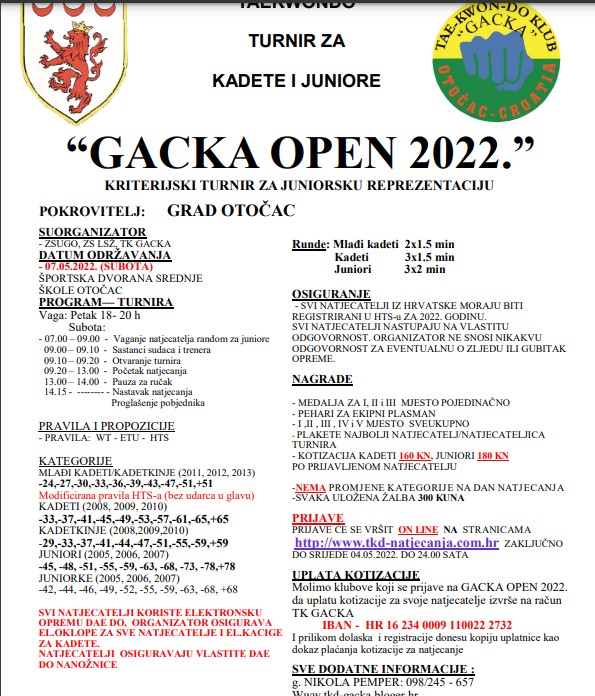 OTOČAC – U organizaciji Zajednice sportskih udruga Grada Otočca i Taekwondo kluba “Gacka” Otočac u subotu, 7. svibnja s početkom u 9:00 sati održati će se tradicionalni taekwondo turnir za mlađe kadete, kadete i juniore GACKA OPEN 2022. Turnir će se održati u sportskoj dvorani Srednje škole Otočac, a rok za prijavu sudionika je još sutra, 4. svibnja (srijeda). Prijave se vrše online i to na stranici http://www.tkd-natjecanja.com.hr Pokrovitelj natjecanja je Grad Otočac.