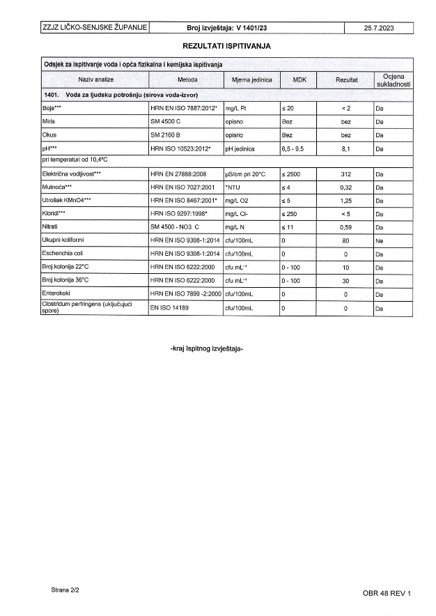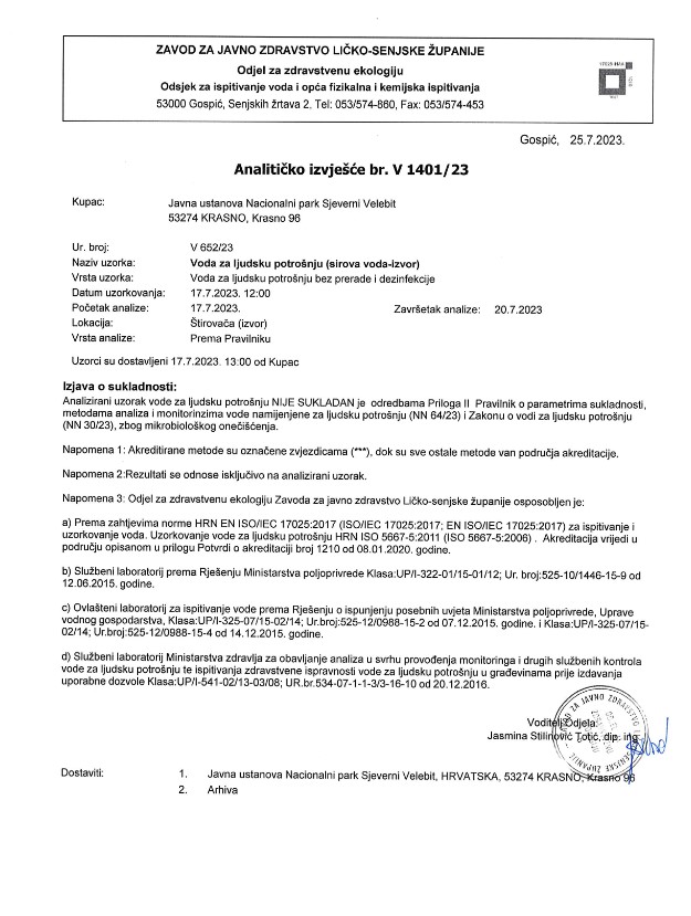 Nakon provedene laboratorijske analize, voda na izvoru Štirovača nije sukladna prema Pravilniku o parametrima sukladnosti, metodama analiza i monitorinzima vode namijenjene za ljudsku potrošnju, poručuju iz NP Sjeverni Velebit . Također, detaljna analiza vode od strane Zavoda za javno zdravstvo Ličko-senjske županije pokazuje da voda nije sukladna prema navedenom Pravilniku i to zbog prisutnih ukupnih koliforma. Uprava Parka upozorava posjetitelje da vodu ne koriste za piće do daljnjega.