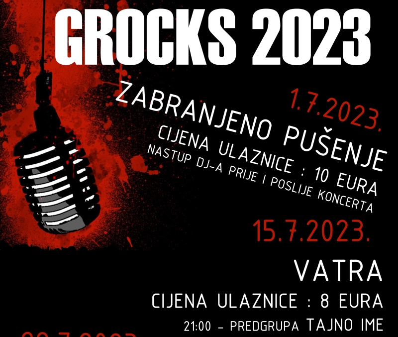 GOSPIĆ – I ove godine za sve ljubitelje rock glazbe KIC Gospić priprema pravi spektakl. GROCKS otvara svoja vrata 1. srpnja koncertom legendarnog Zabranjenog pušenja uz legendarne hitove “Jugo 45”, “Zenica Blues”, “Djevojčice kojima miriše koža”, “Možeš imat moje tijelo”, “Karabaja” i mnoge druge. Ulaznice se mogu kupiti po cijeni od 10,00 eura.